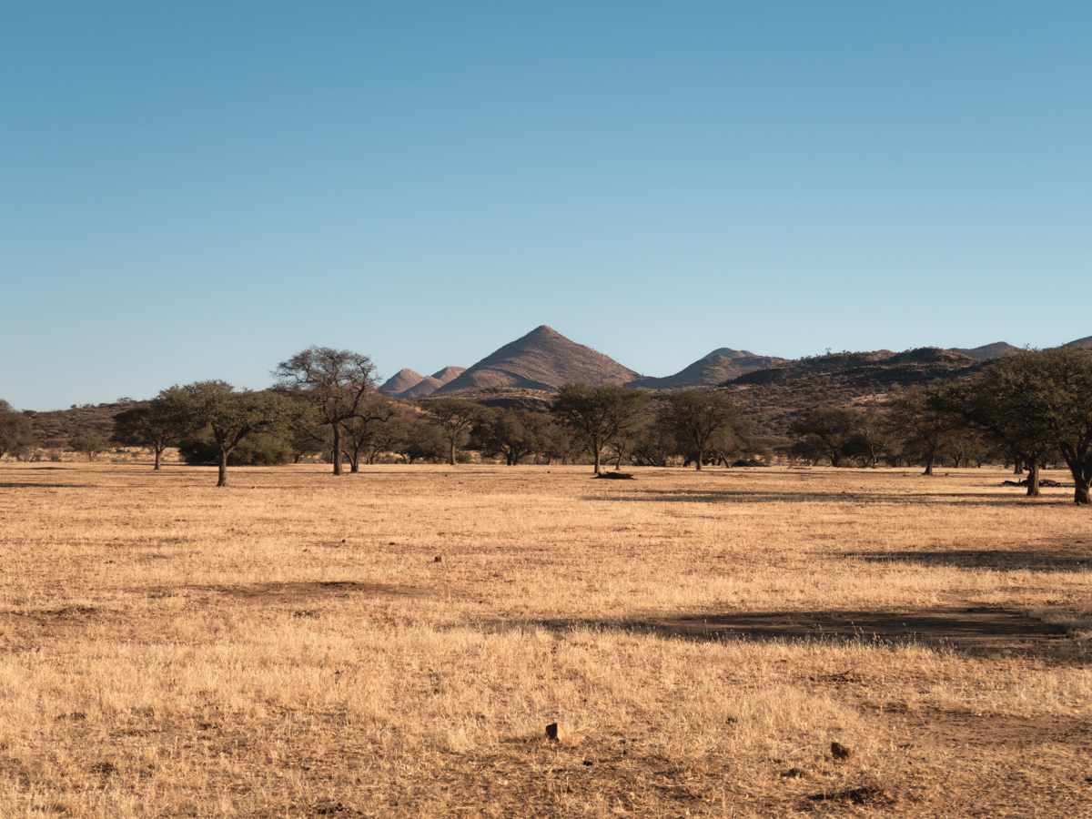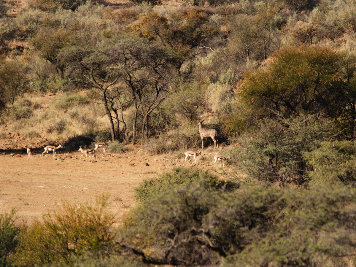 Auf Krumhuk leben Bergzebras, sie sind etwas kleiner, vergleichbar mit Eseln. Die meisten anderen größeren Tiere haben wir schon bei unseren Spaziergängen gesehen. Springböcke ziehen zahlreich durch die „goldene Aue“, so heisst hier ein Landstrich in dem nicht gejagt wird und mehrere Wasserbecken liegen. Das sorgt dafür, dass sich die Tiere häufig in der Nähe aufhalten. In der Regenzeit (Januar-April) steht hier hohes Gras. Jetzt liegt die „goldene Aue“ gold und rötlich vom Sand und den abgegrasten Stoppeln da. Der einzige Jäger in der „goldenen Aue“ ist der Leopard. Die Gegend in der wir uns befinden hat angeblich die höchste Dichte von Leoparden. Sie sind sehr scheu, sodass selbst die meisten Menschen, die hier wohnen, sie noch nicht zu Gesicht bekommen haben. Nur die Spuren verraten, dass sie da sind und die Aufnahmen der Nachtkameras. Immer wieder findet man abgenagte Skelette von anderen Tieren.