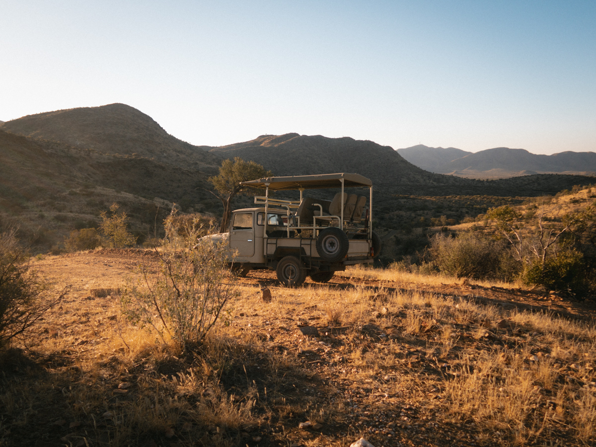 Der Gamedrive startete vor unserer Ferienwohnung. Florian fuhr mit einem alten Toyota vor, der auf seiner Pritsche erhöht zwei Sitzreihen hat mit einem Dach darüber, sodass man, vor der Sonne geschützt, über das Dach des Führerhauses schauen kann und einen guten Rundblick hat. Wir wurden da oben richtig durchgeschüttelt und manchmal haben wir nicht mehr den Sitz unter uns gespürt.