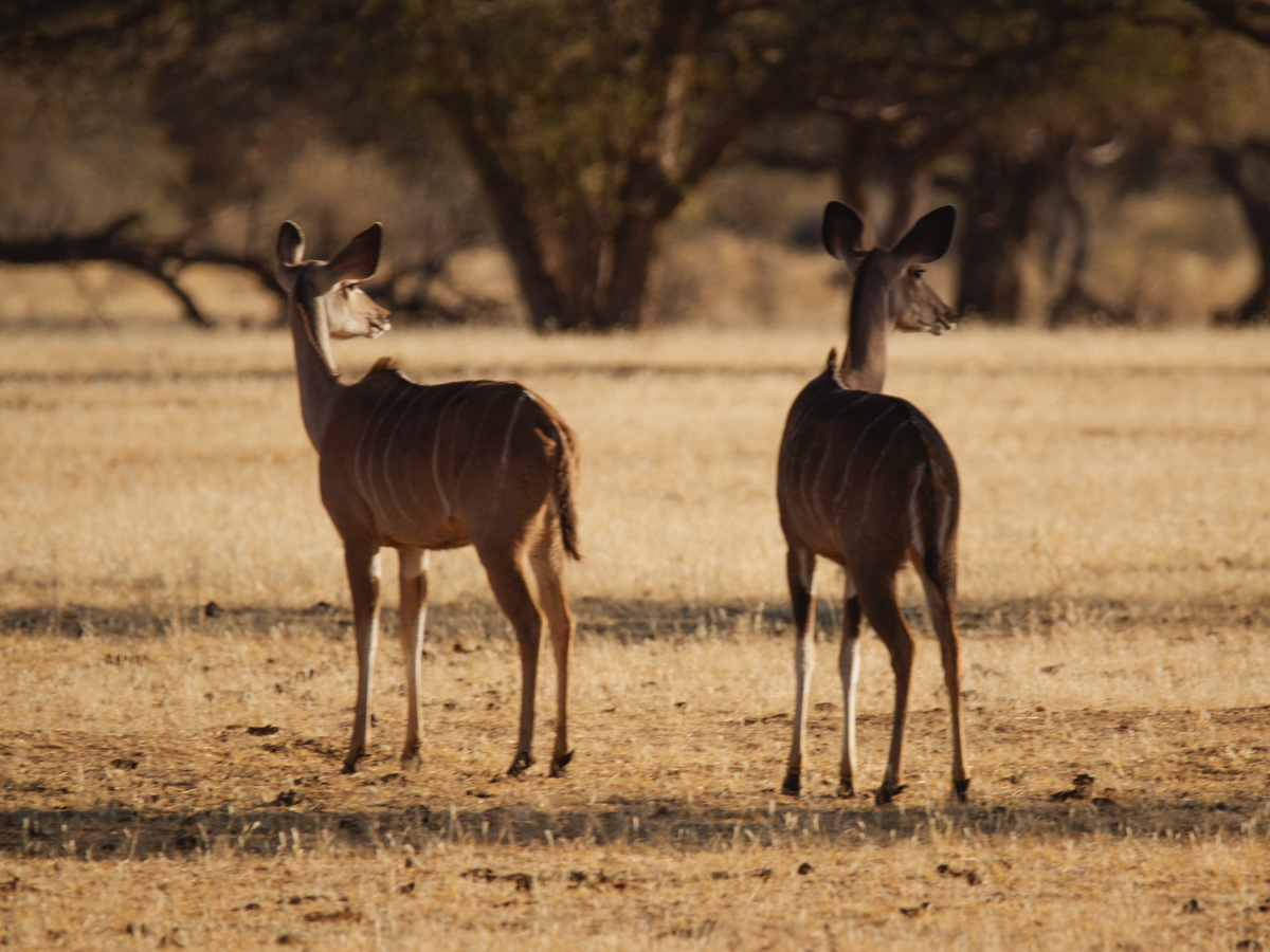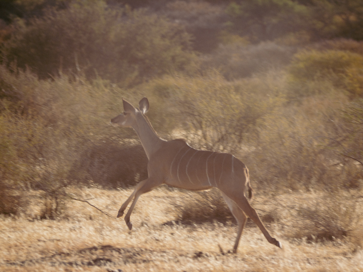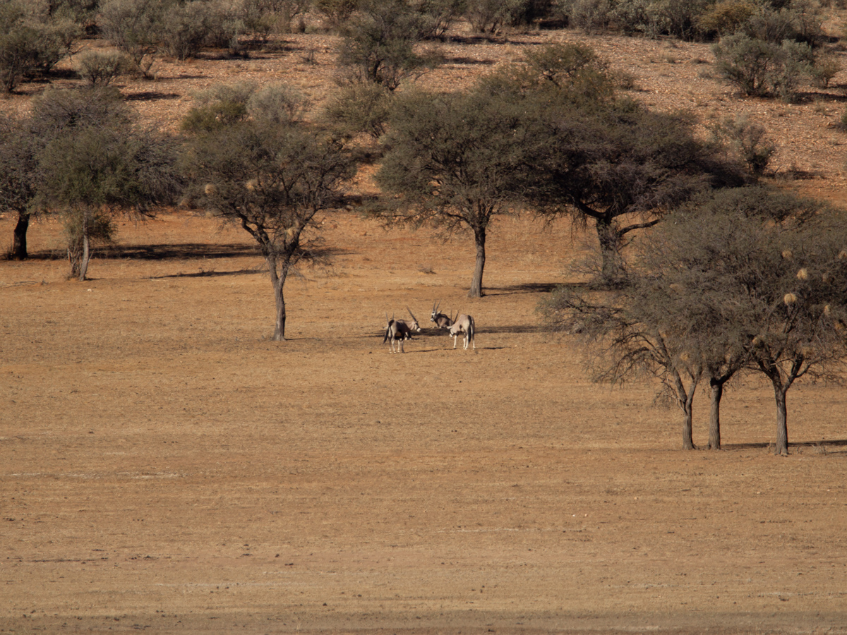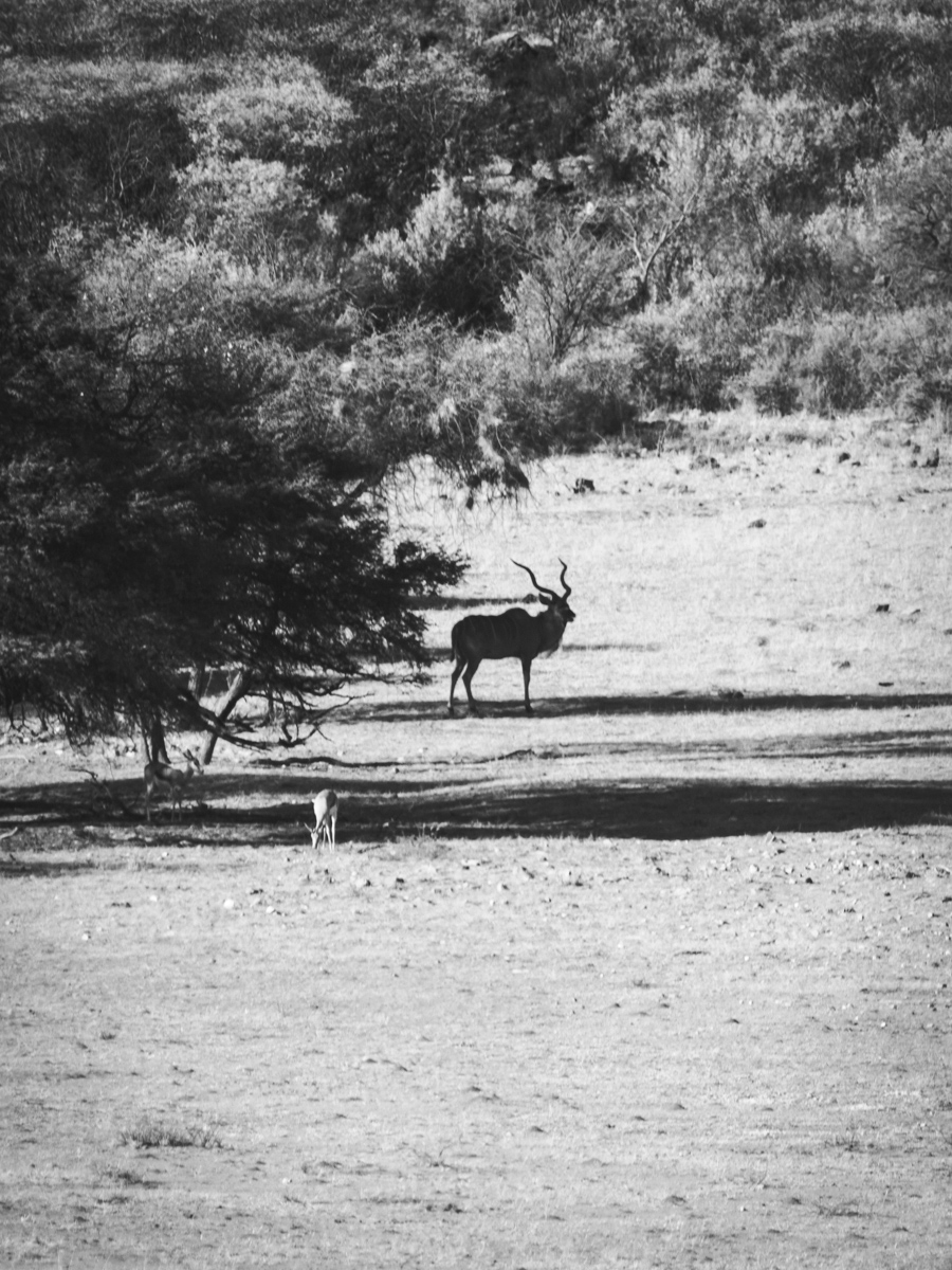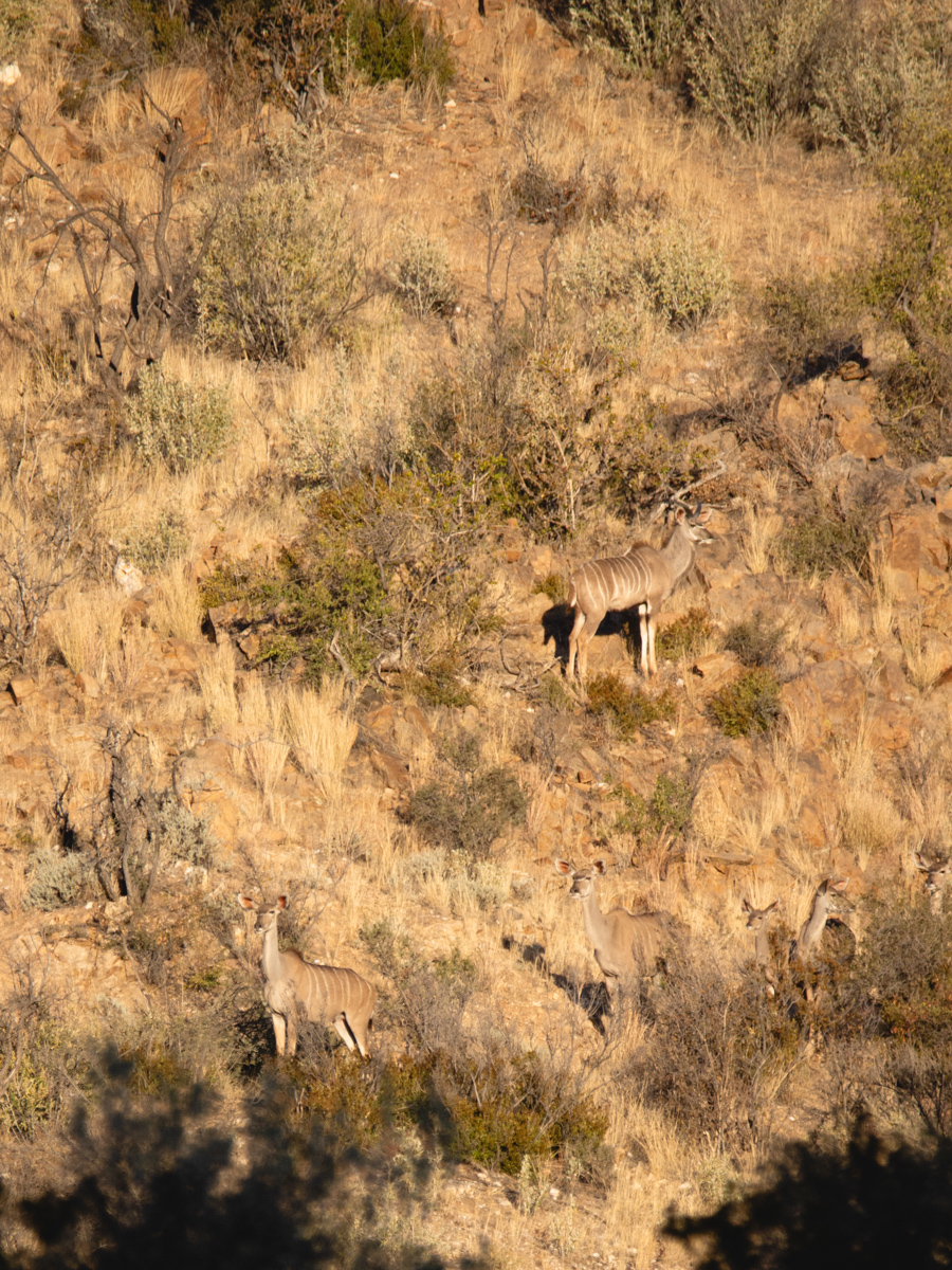 Weitere Tiere sind Kudus. Die Männchen haben spiralförmig gewundene Hörner, die Weibchen haben haben keine Hörner. Man kann sie gut an ihren grossen Ohren erkennen. Die Kudus können besser Hören als Sehen. Somit kamen wir ihnen auch Näher als den ähnlich grossen Oryx-Antilopen. Die Oryxe haben lange gerade Hörner, die sie auch zu ihrer Verteidigung z.B gegen Löwen einsetzen. Oft haben wir sie im Busch entdeckt. Einmal, als wir auf einer Decke saßen, schrieben und malten, standen sie plötzlich hinter uns und ich kann nicht genau sagen, ob sie oder wir uns mehr erschreckt haben, da wir sie überhaupt nicht kommen hörten.