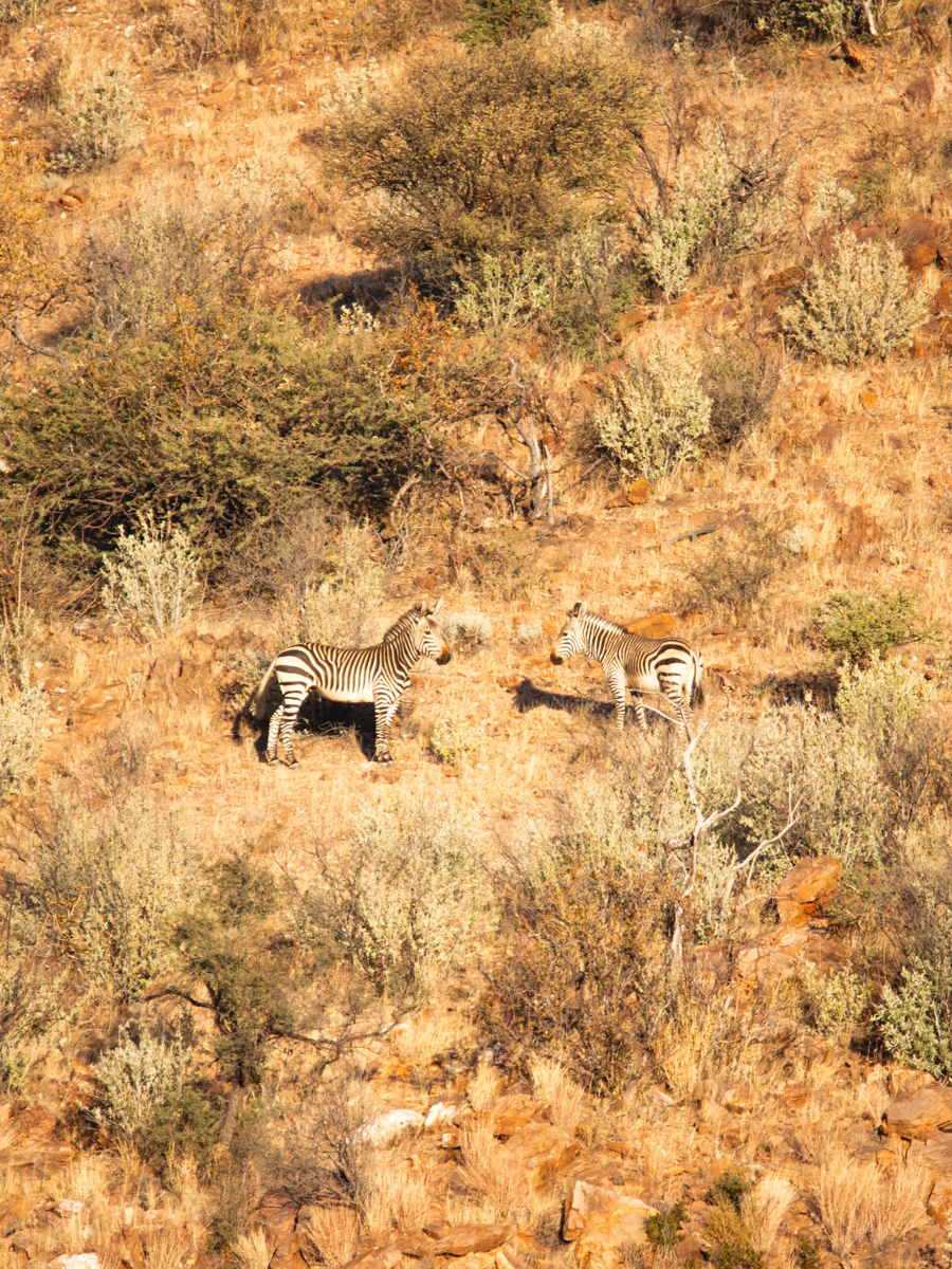 Wir sehen viele Spuren von Zebras, doch selber entdeckten wir sie bisher nicht. Die Sonne geht schon unter und wir machen uns auf den Rückweg. Da erblicken wir plötzlich eines auf einem Bergkamm. Wir bleiben stehen, denn jetzt sehen wir auch noch zwei weitere Zebras am Hang stehen. Und wenig unterhalb auch Kudus. Könnt ihr sie auch entdecken?