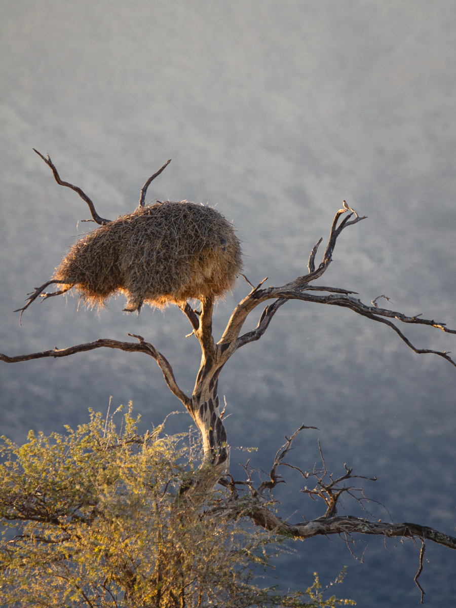 Als wir nun alles gesehen hatten, fahren wir unter einem farbenfrohen Himmel weiter. Auf dem Weg sahen wir noch ein riesiges Strohgebilde in den Bäumen, ein Webervogelnest. Die Webervögel bauen diese großen Nester in Gemeinschaft und bewohnen sie zusammen. Wie eine Art „Vogelhotel“. „Nicht selten“, erzählt uns Florian, „lebt mit ihnen auch eine Schlange zusammen, die sich ab und zu ein Ei nimmt, dafür aber das Nest vor anderen Tieren schützt“. Kurz bevor es dunkel wird kommen wir in unserer Unterkunft auf Krumhuk wieder an.