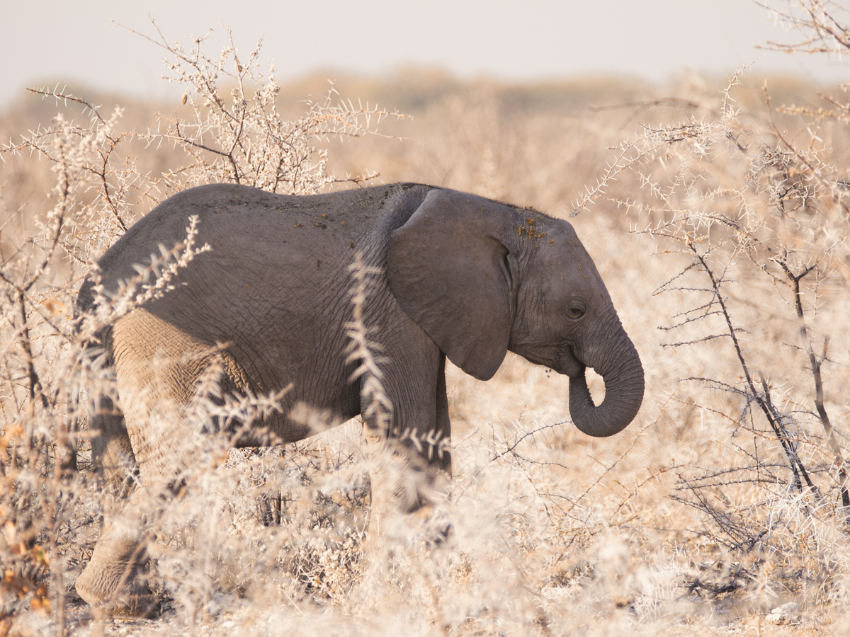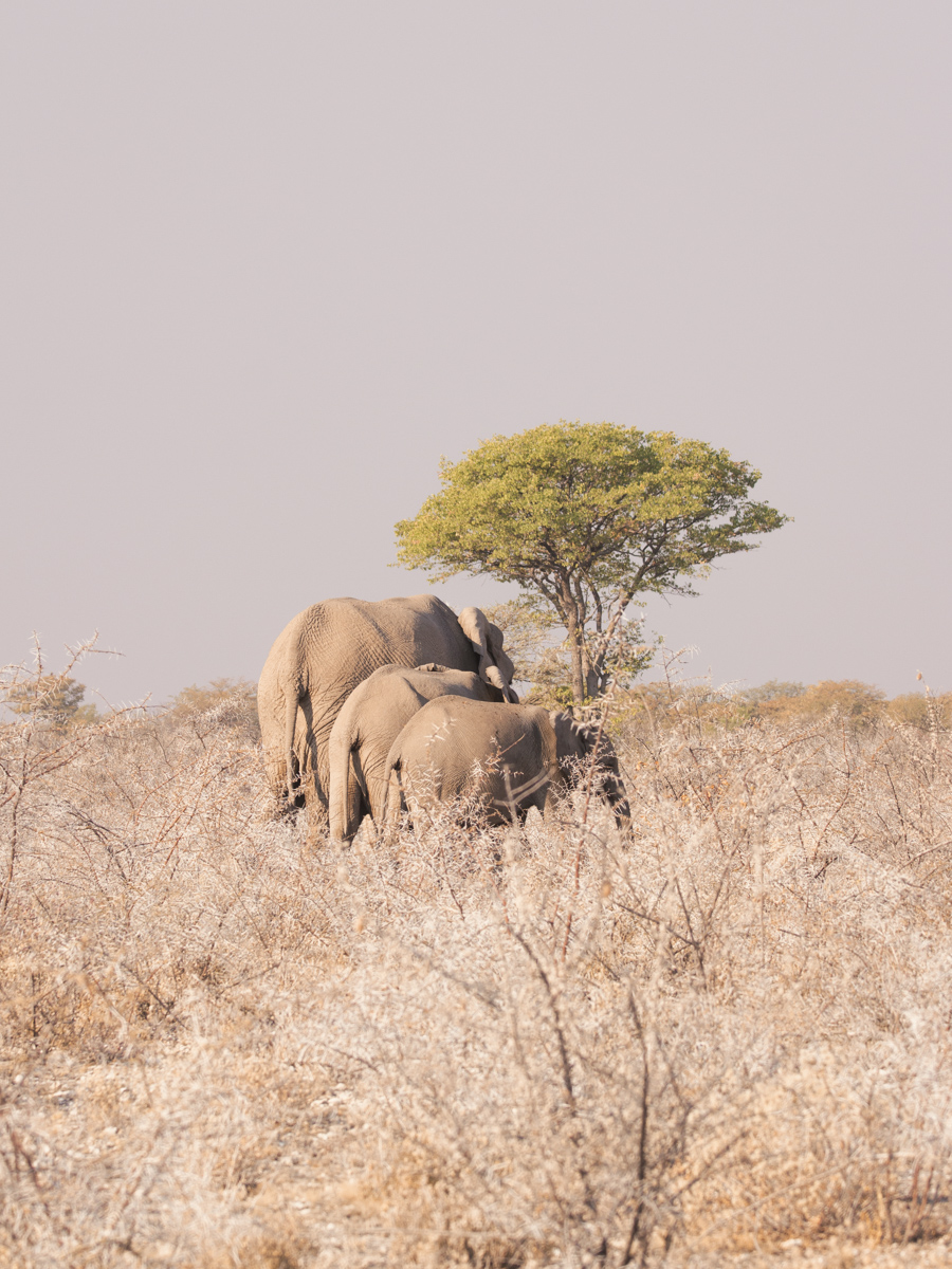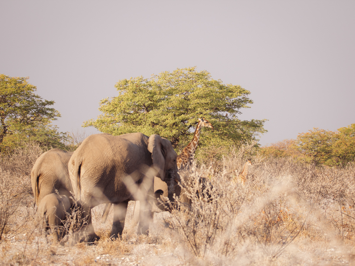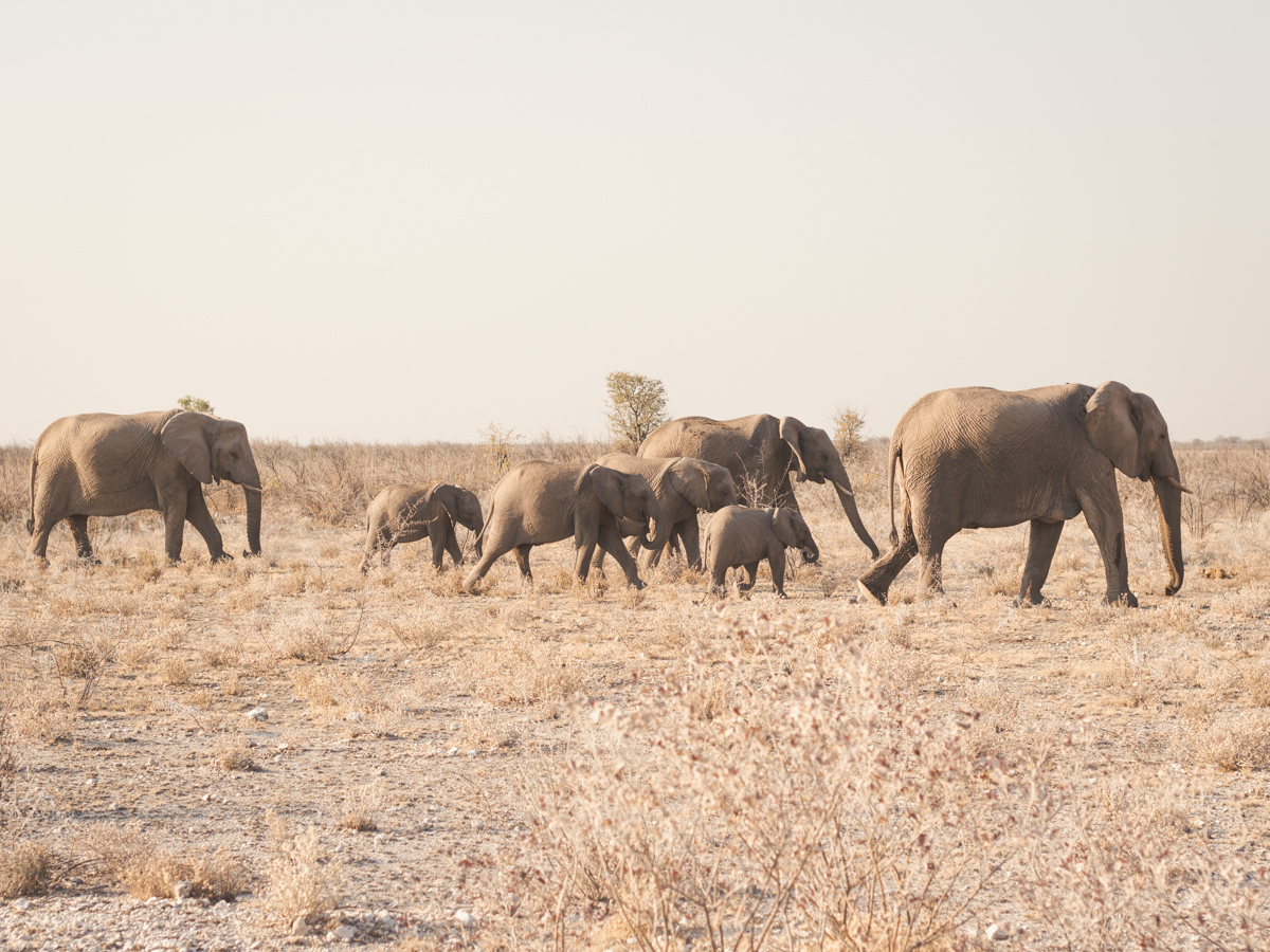 Unser erster Stopp ist das Ombika Wasserloch. Viele Tiere die wir bisher nur aus der Ferne von Krumhuk kannten, sehen wir hier nahe am Auto vorbei schreiten, hüpfen und traben. Kudus, Springböcke, Gnus, Oryxe, Schakale und auch Strausse. Wir folgen den Spuren der Elefanten, die klar zu erkennen sind. Schon nach kurzer Zeit sehen wir die Elefanten auf der linken Seite im dichteren, noch laubigen Gebüsch. Sie fächeln sich mit ihren grossen Ohren stetig frische Luft zu und immer wieder werfen sie Sand über ihren Rücken. Ein kleines Elefantenbaby liegt zwischen den Bäumen. Es ist wirklich ein anmutiger Anblick diese großen, grauen Tiere. Weise kommen sie uns vor. Sobald es weiter geht wird das Elefantenkind von einer Mutterkuh mit dem Fuß hochgezogen.