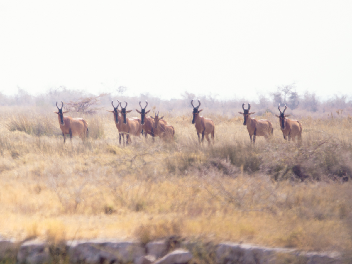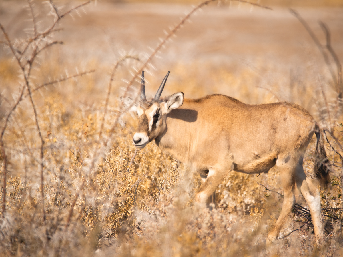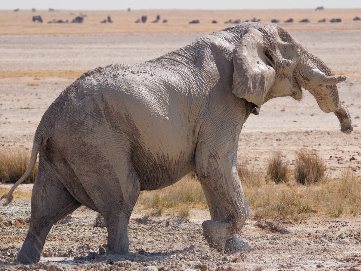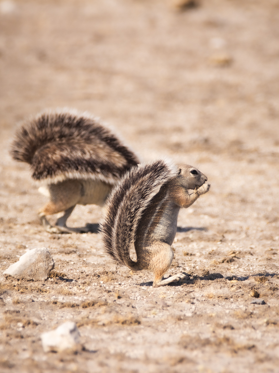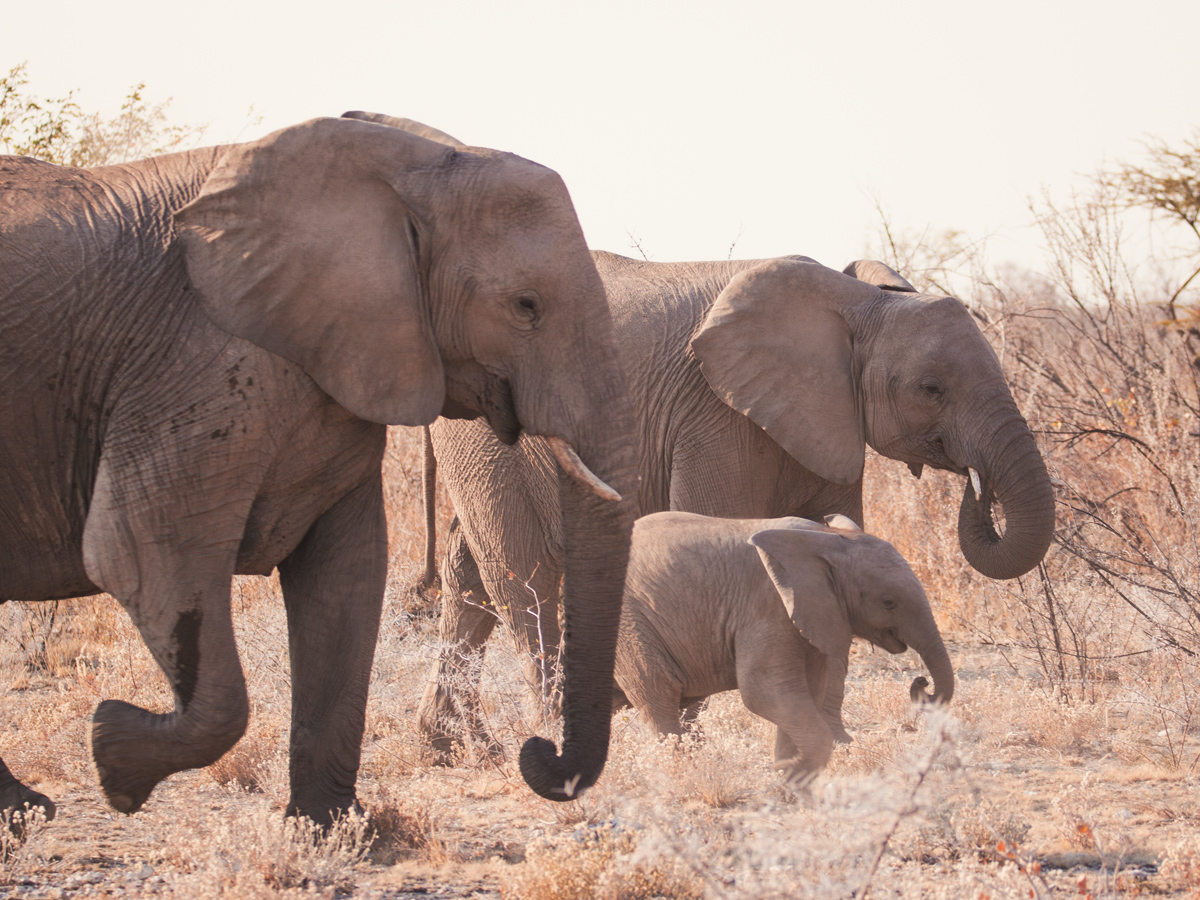 Unser erster Stopp ist das Ombika Wasserloch. Viele Tiere die wir bisher nur aus der Ferne von Krumhuk kannten, sehen wir hier nahe am Auto vorbei schreiten, hüpfen und traben. Kudus, Springböcke, Gnus, Oryxe, Schakale und auch Strausse. Wir folgen den Spuren der Elefanten, die klar zu erkennen sind. Schon nach kurzer Zeit sehen wir die Elefanten auf der linken Seite im dichteren, noch laubigen Gebüsch. Sie fächeln sich mit ihren grossen Ohren stetig frische Luft zu und immer wieder werfen sie Sand über ihren Rücken. Ein kleines Elefantenbaby liegt zwischen den Bäumen. Es ist wirklich ein anmutiger Anblick diese großen, grauen Tiere. Weise kommen sie uns vor. Sobald es weiter geht wird das Elefantenkind von einer Mutterkuh mit dem Fuß hochgezogen.
