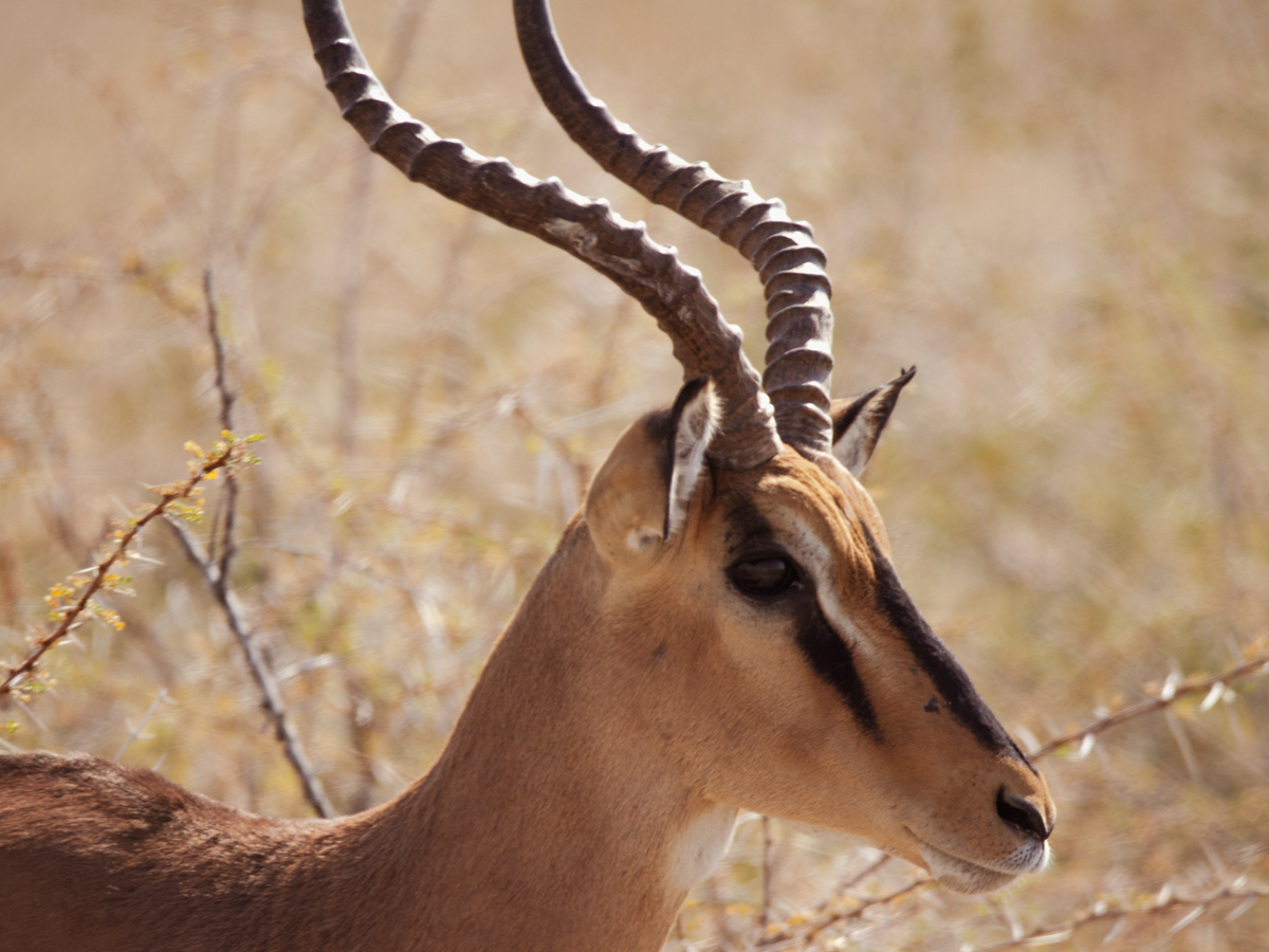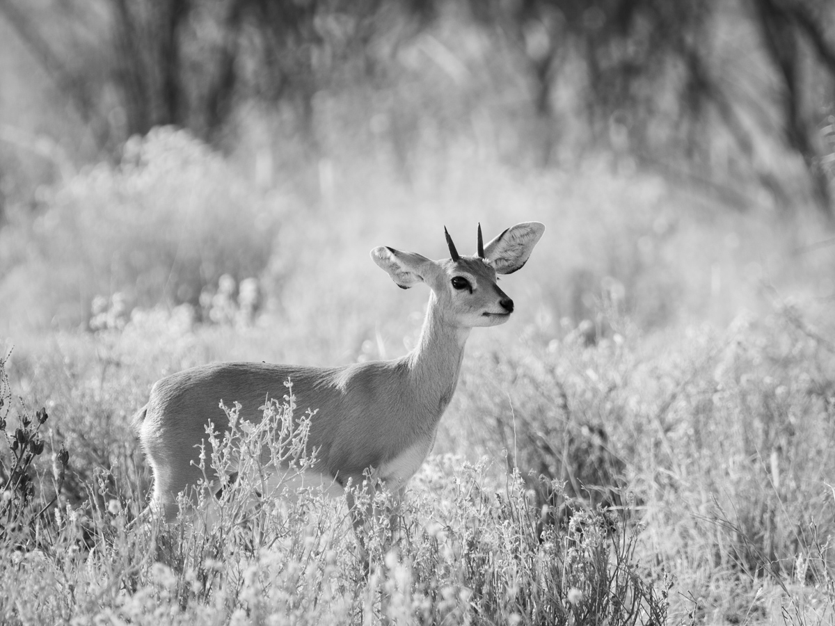 Müde und voll mit Eindrücken begeben wir uns auf den Weg zum Camp. Doch das tollste Tier sollten wir noch entdecken. Denn plötzlich ruft Verena: „da steht ein Dikdik!“ Und wirklich: auf der rechten Seite steht ein winzig kleines Tier mit vertrauensvollen großen Augen, plüschigen, riesigen Ohren und einem lieblichen Gesicht. Dickdik’s ernähren sich gerne von nährstoffreicher Nahrung. Als es einmal aufguckt blickt es uns mit einer Blume im Fell an.