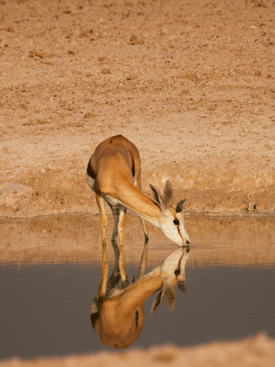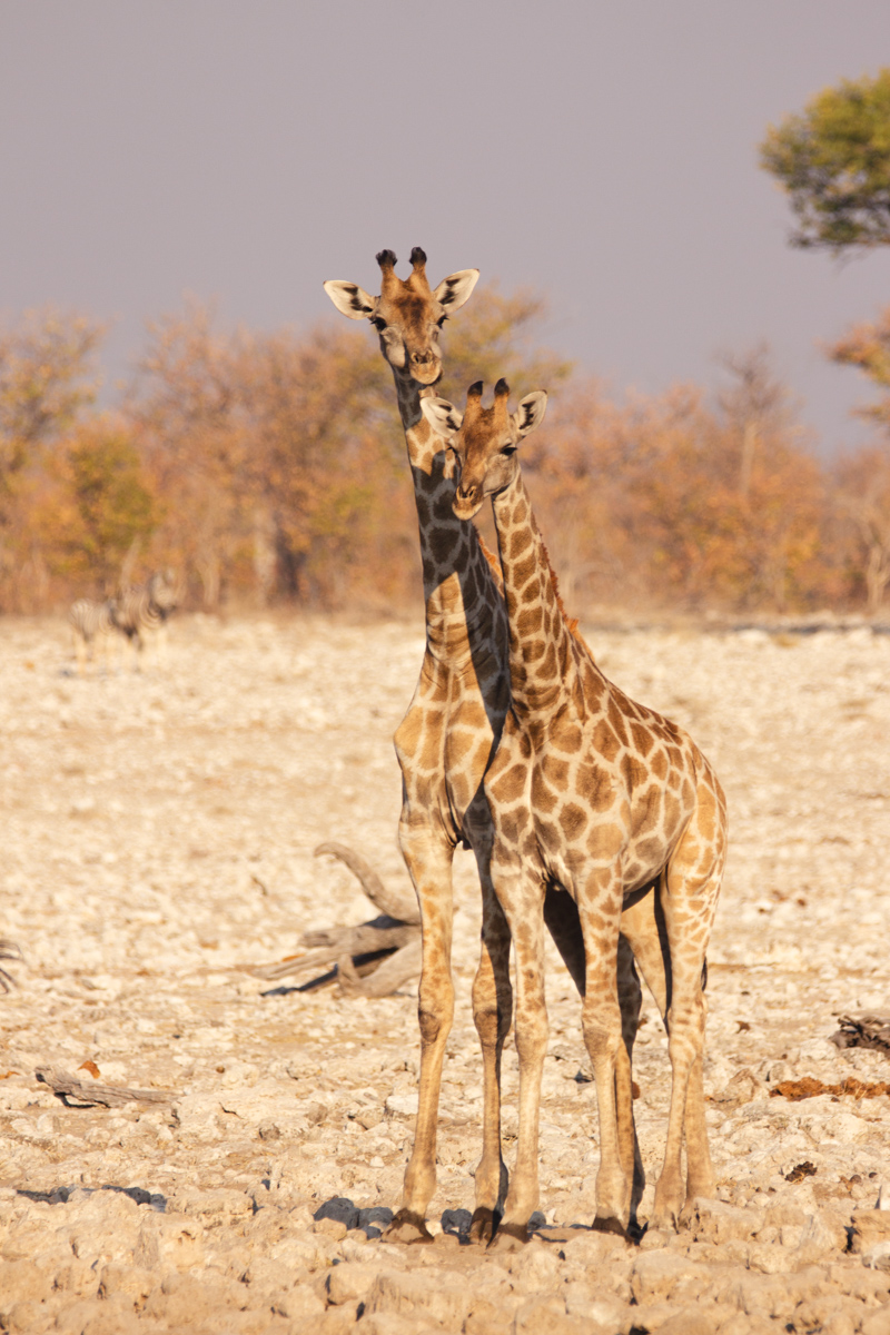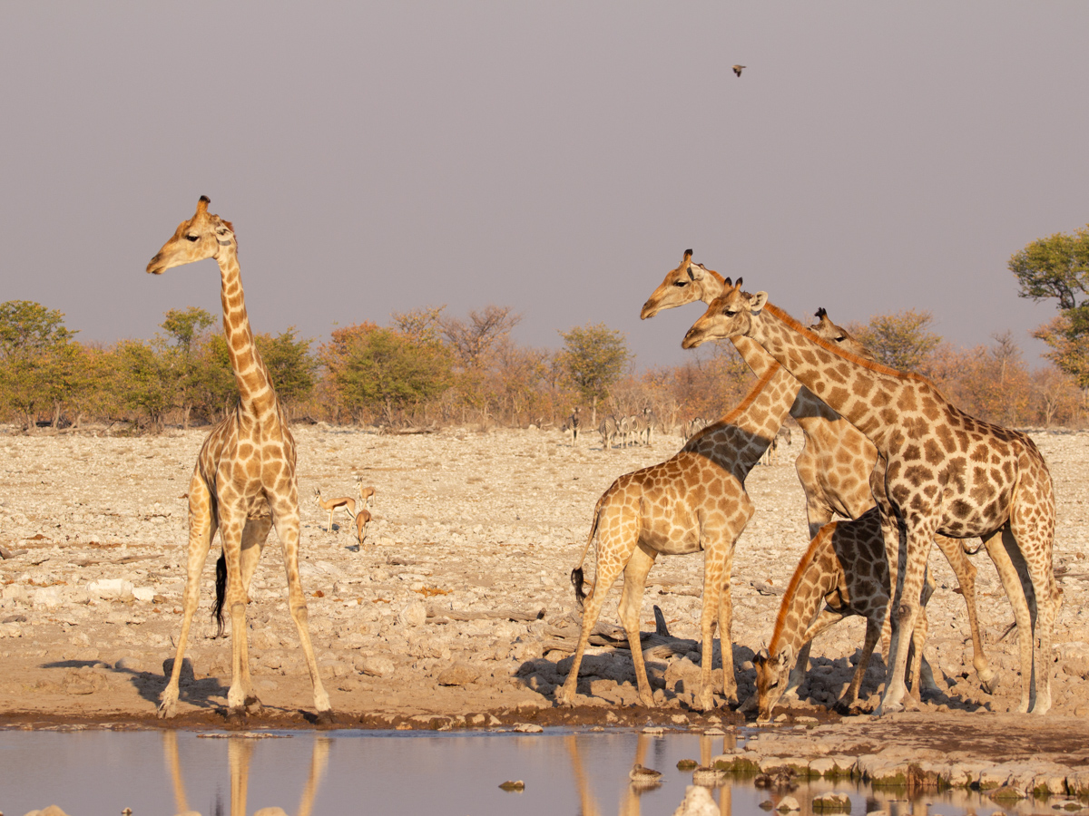 Der Tag neigt sich langsam dem Ende zu und wir wollen pünktlich zum Camp um noch vor dem Sonnenuntergang das Zelt aufbauen zu können. Noch ist es eine Strecke zu fahren und wir kommen an der Rietfontein vorbei, ein Wasserloch, dass aussieht wie eine kleine grüne Oase. Drei Elefanten plantschen gemütlich im Wasser, eine große Zebraherde sehen wir in der Ferne. Gemütlich schreiten ein paar Giraffen mit ihren Kindern zum Wasserloch und beginnen ihre Trinkposition einzunehmen. Die einen machen mit ihren Vorderbeinen eine Art „V“, andere wiederum knicken die Beine dabei noch ein. Immer wieder gucken sie nervös zu uns herüber. Es scheint eine Position zu sein, in der sie besonders angreifbar sind.