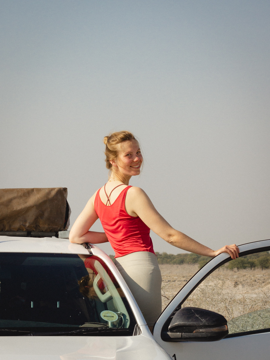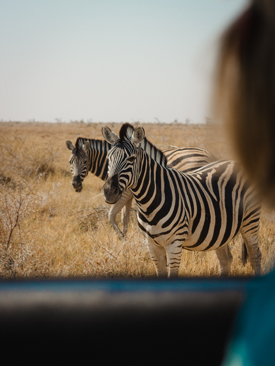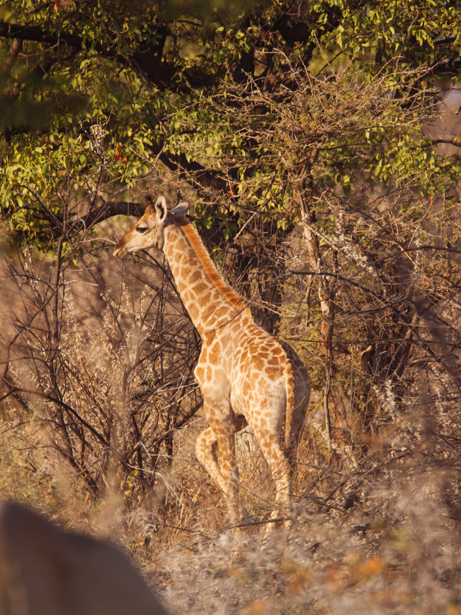 Der Tag neigt sich langsam dem Ende zu und wir wollen pünktlich zum Camp um noch vor dem Sonnenuntergang das Zelt aufbauen zu können. Noch ist es eine Strecke zu fahren und wir kommen an der Rietfontein vorbei, ein Wasserloch, dass aussieht wie eine kleine grüne Oase. Drei Elefanten plantschen gemütlich im Wasser, eine große Zebraherde sehen wir in der Ferne. Gemütlich schreiten ein paar Giraffen mit ihren Kindern zum Wasserloch und beginnen ihre Trinkposition einzunehmen. Die einen machen mit ihren Vorderbeinen eine Art „V“, andere wiederum knicken die Beine dabei noch ein. Immer wieder gucken sie nervös zu uns herüber. Es scheint eine Position zu sein, in der sie besonders angreifbar sind.