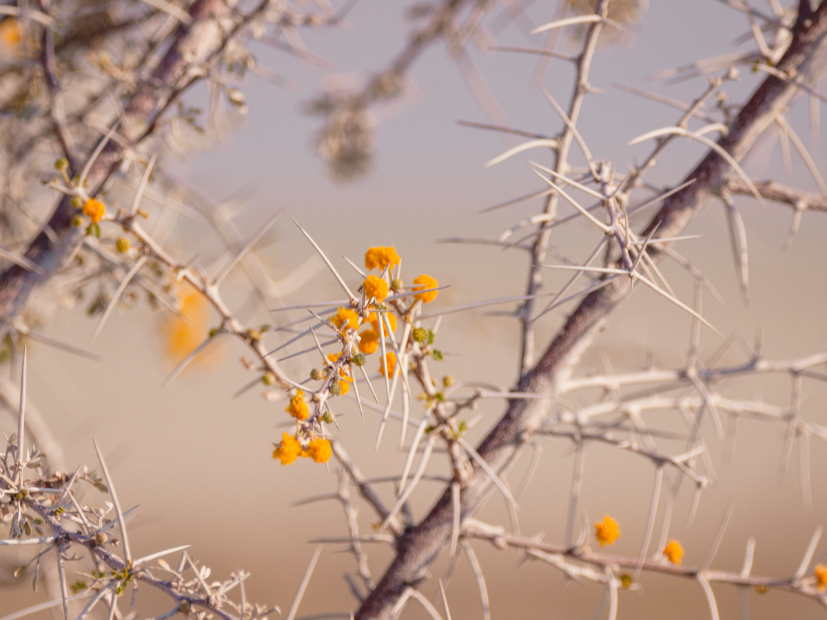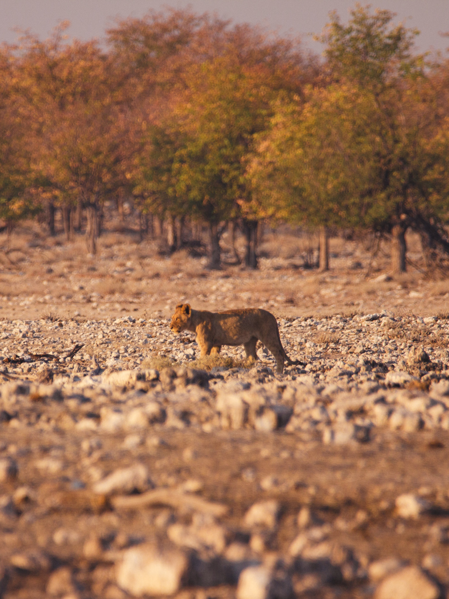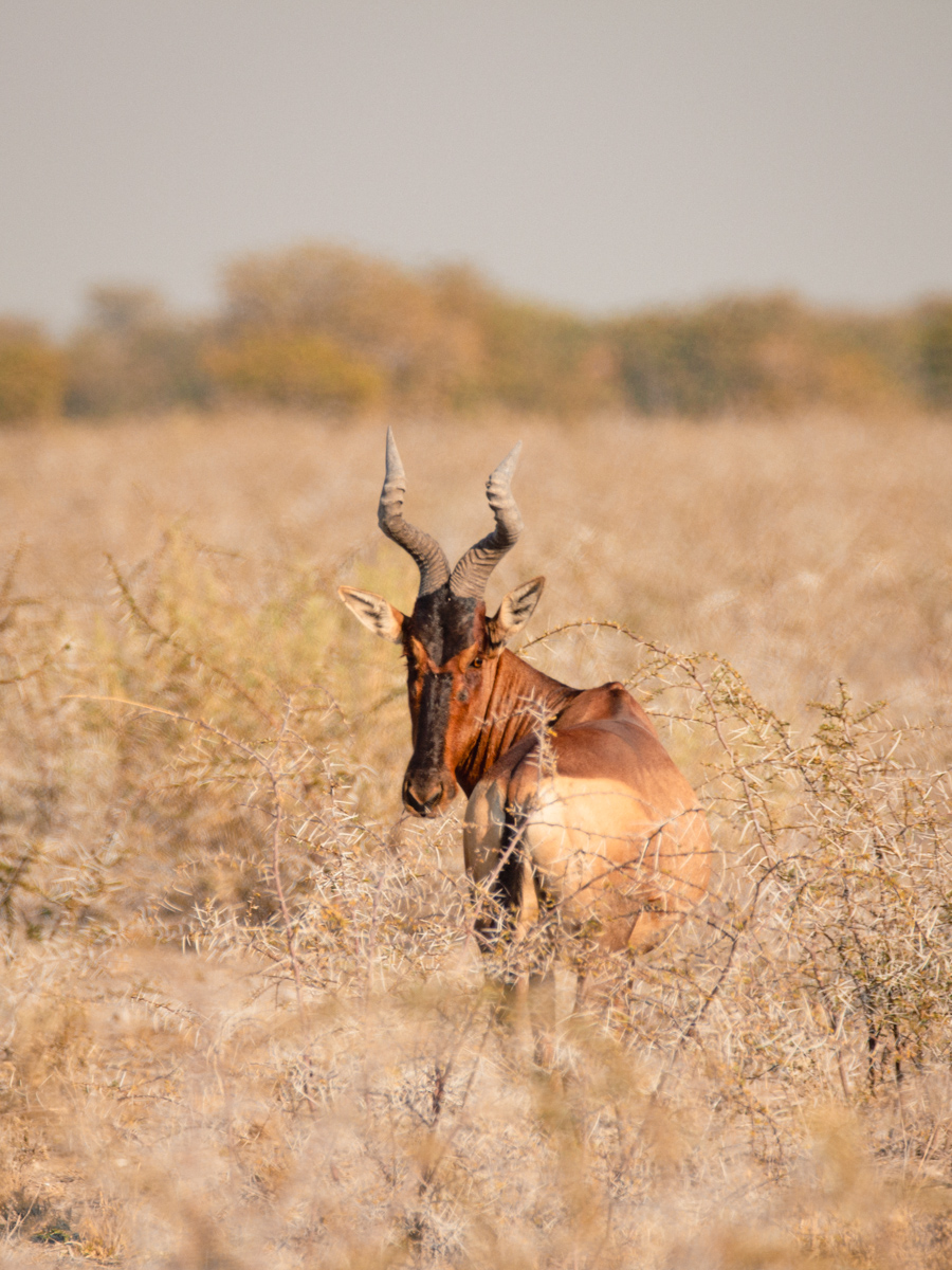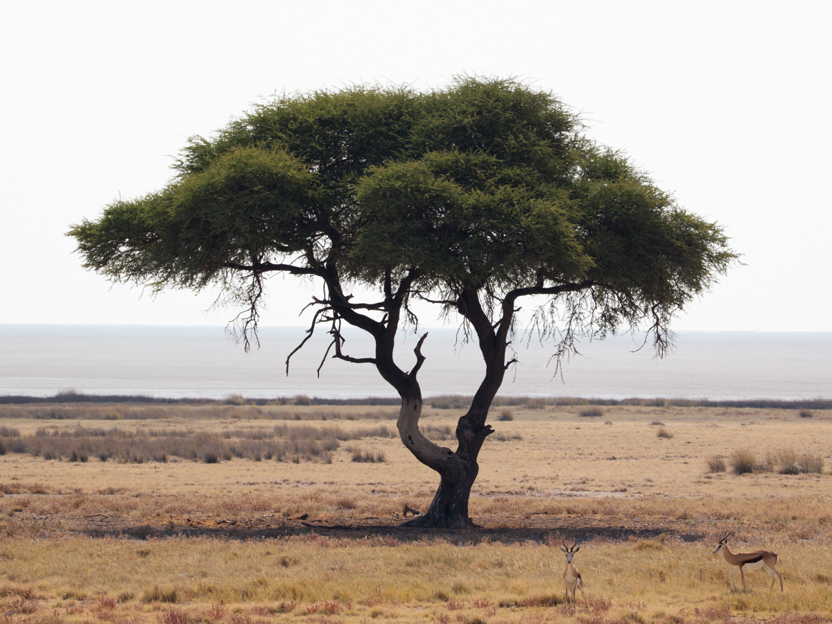 Wie jeden Tag scheint auch heute die Sonne munter am Himmel, als wir das erste Mal auf die Tore des Etosha Nationalparks zufahren. Am Abend zuvor hatten wir die Sonne als leuchtend roten Feuerball über dem Buschwerk untergehen sehen. Das bildet einen starken Kontrast zu der hellen Erde, die immer heller wurde, fast weiß, je näher wir dem Park kamen.
