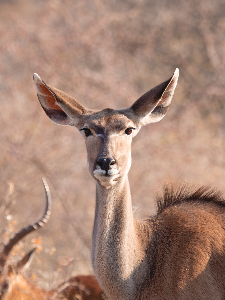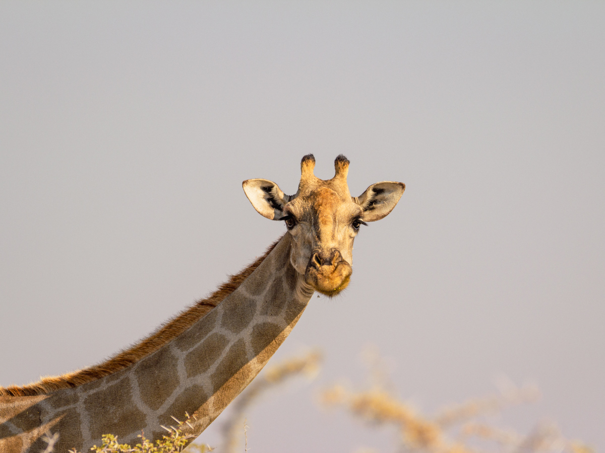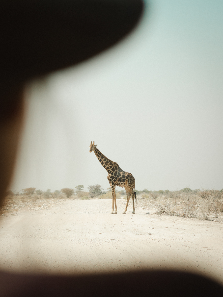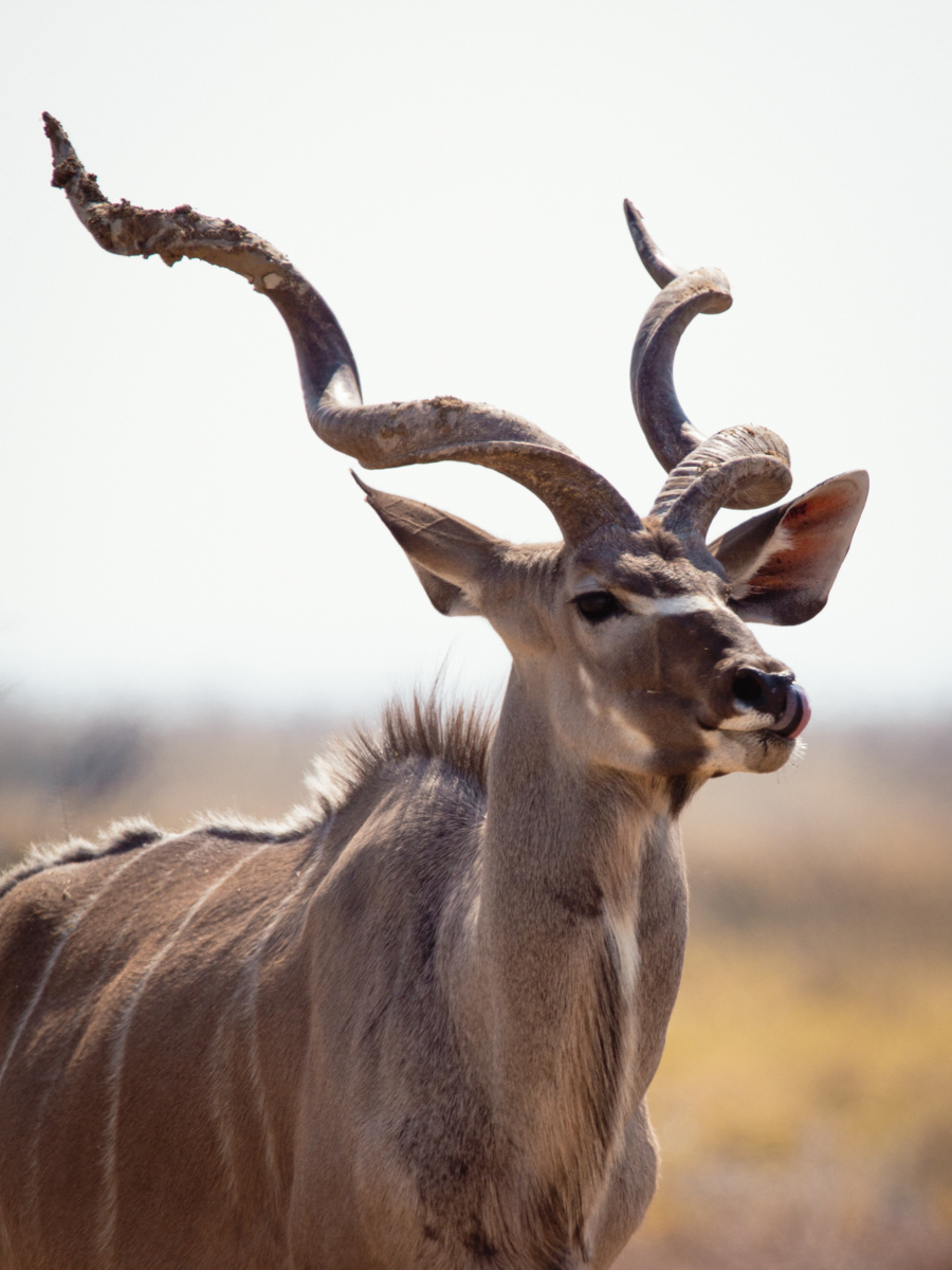 Das liegt an dem hohen Salzanteil der Erde in der Nähe des Etosha Nationalparks mit der 130 km langen und 50 km breiten Salzpfanne. Dass die Wildtiere hier oben im Norden an Menschen gewöhnt sind, wird uns schon klar, als über unseren Campingplatz ein Kudu Männchen gemütlich entlang spaziert und sich nicht aus der Fassung bringen lässt. Sogar Giraffen haben wir schon gesichtet. Sie beobachten uns neugierig, als wir mit dem Auto vorbei fahren. Die ersten Giraffen! Das kann nur gut werden! Und das wurde es auch.