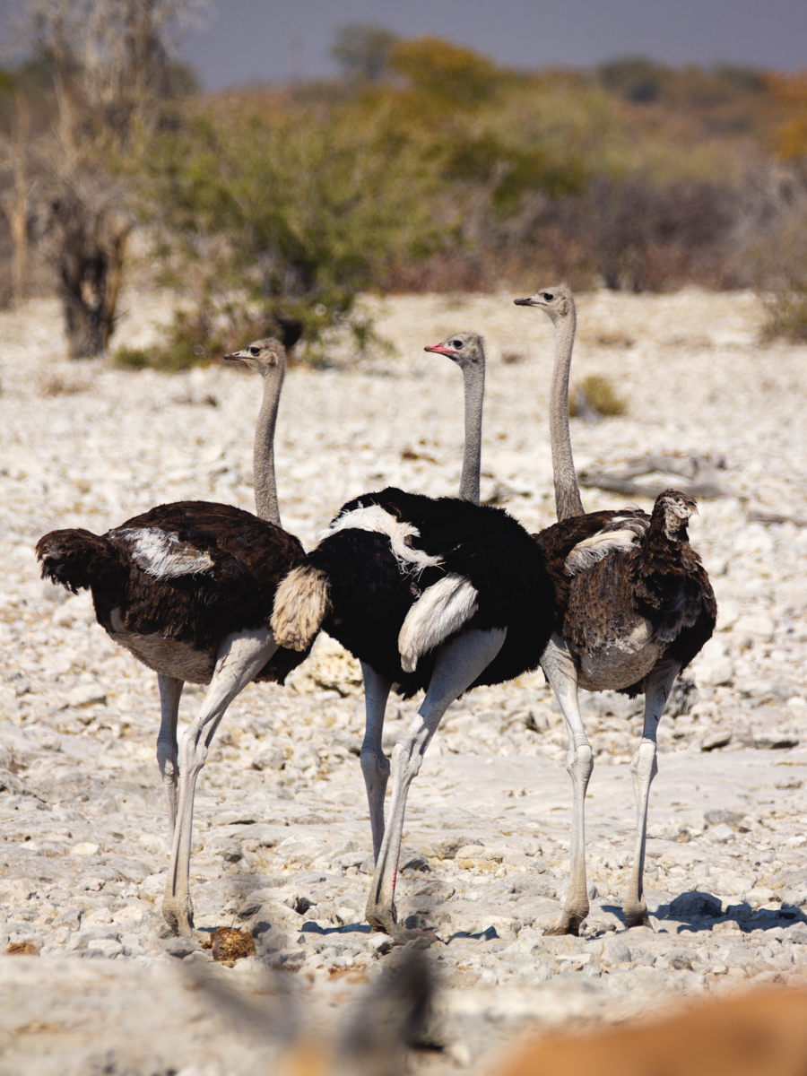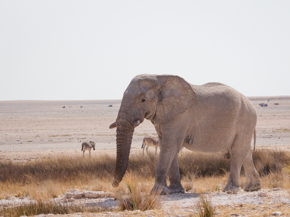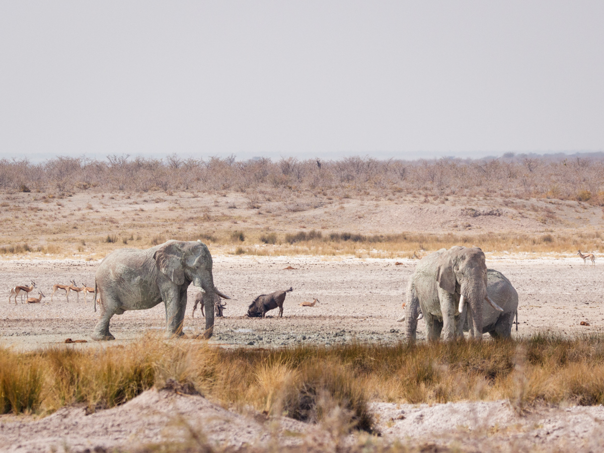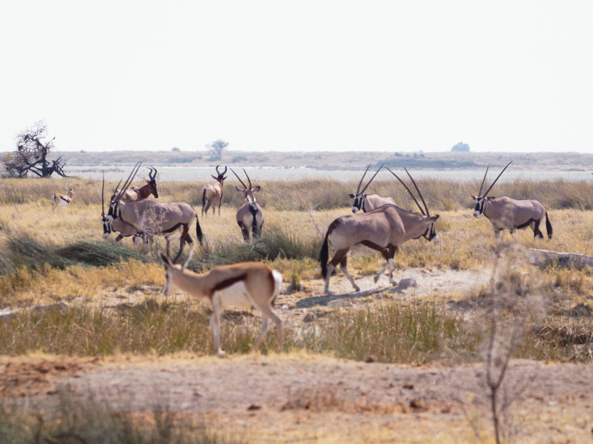 Am dritten Tag müssen wir den Park schon um 14 Uhr verlassen, deshalb fahren wir früh los in Richtung Etosha Outlook, denn noch einmal möchten wir die Stille der Salzpfanne geniessen. Später entdecken wir ein idyllisch gelegenes Wasserloch, an dem sich die Tiere nur so tummeln: Kudus, Gnus, Springböcke, Oryxe und Impalas. Dahinter erstreckt sich die Salzpfanne. Es ist ein wunderschönes Bild. Auf unserem Weg begegnen wir außerdem noch einem großen Elefantenbulle. Er steht ganz nah an der Straße, so nah, dass wir ihn streicheln könnten. Doch das tun wir natürlich nicht. Die Landschaft hat sich geändert, jetzt sind kaum noch Sträucher und Bäume zu sehen, sondern eine weite Ebene mit Gräsern und Heide. Dort liegen grosse Gnu - Herden, Zebras weiden und vereinzelt sehen wir Springböcke. Immer wieder kann man in der Ferne Strausse erahnen.
