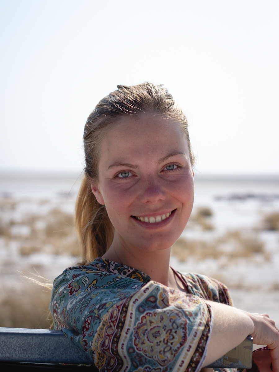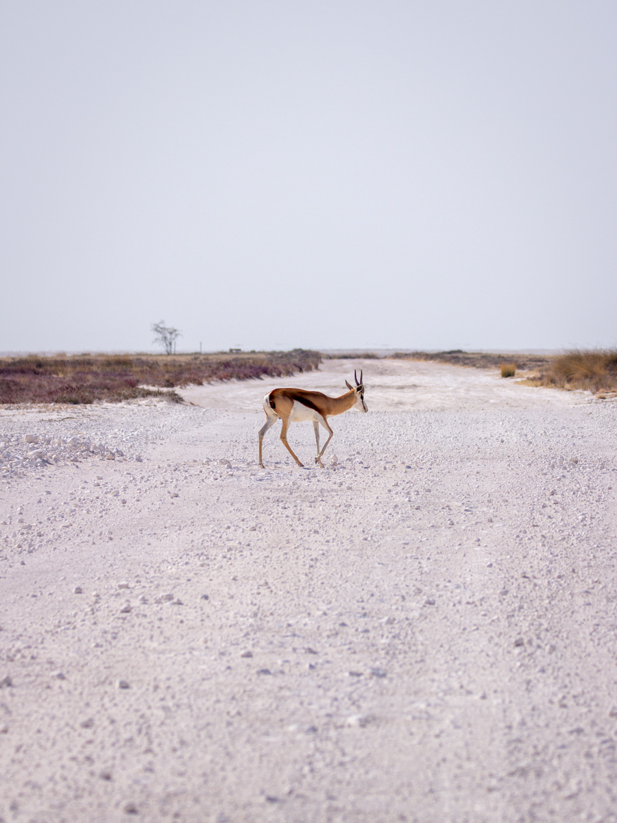 Unser nächster Halt ist das Okaukujeo Camp. Dort müssen wir unseren Parkeintritt bezahlen. Anschliessend geht die Strasse als Schotterpiste weiter. Der Untergrund ist übersät von Huckeln und Wellen und es ist rutschig zu fahren. Zuerst fahre ich langsam um dem Auto nicht zu schaden, doch das auf,- und ab war fast nicht zu ertragen in diesem Tempo. Man musste schneller fahren, damit man auf den Spitzen der Wellen fährt. An der nächsten Abbiegung geht es zu einem „Pan Outlook“, dort kann man auf die Weite der Etosha Salzpfanne gucken, die heutzutage aus getrocknetem Lehm und Salz besteht. Vor 100 Millionen Jahren ist diese Ebene entstanden und wurde von verschiedenen Zuflüssen gespeist. Es wird auch vermutet, dass der Kunene River vor 16.000 Jahren einst seinen Weg durch die Etosha Ebene genommen hat. Durch die Erdplatten Verschiebung änderte sich der Verlauf des Flusses und der See trocknete aus und wurde zur Salzpfanne. In der Sprache der Ovambo heisst Etosha: „Großer, weißer Ort“. Die Weite ist beeindruckend, man sieht nichts als Horizont und dem verkrusteten Boden. Interessanterweise sieht die Salzpfanne oft fast schwarz aus wenn man in die Ferne guckt, obwohl sie von Nahem natürlich weiss ist. Ein Geheimnis, dass uns noch verschlossen bleibt.