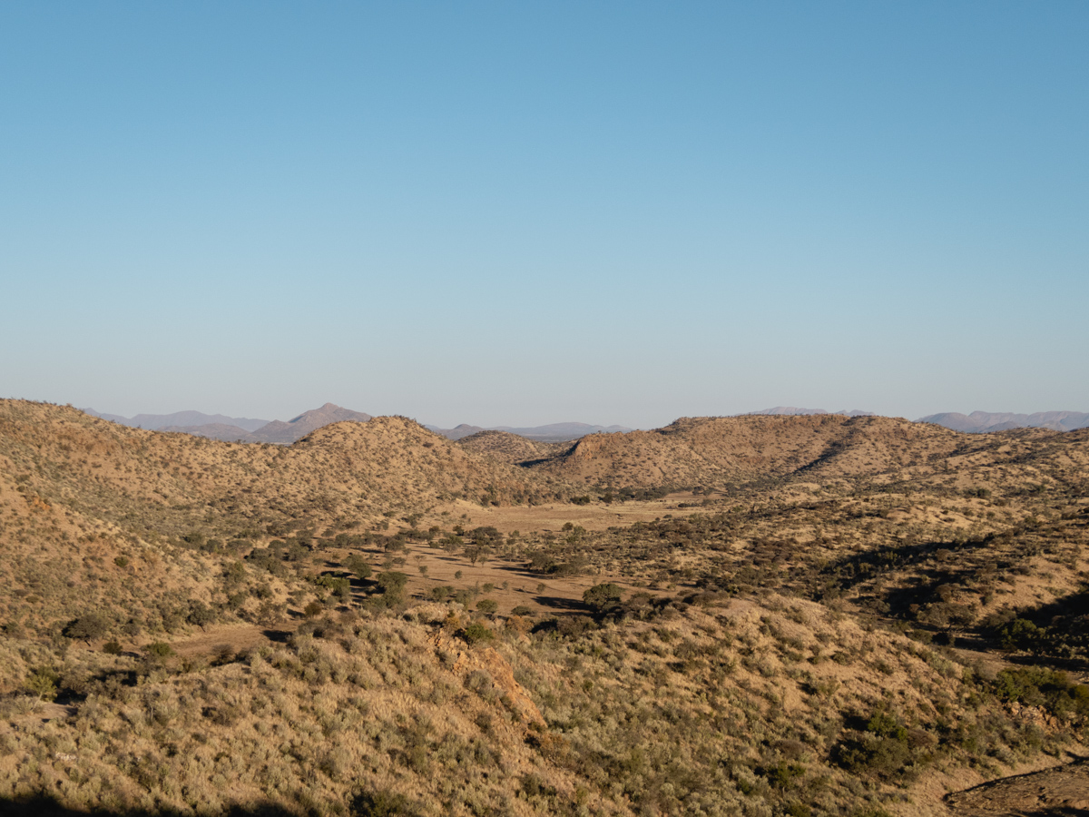 Dann geht es hoch in die Berge, die verhältnismäßig klein aussehen, wenn man bedenkt, dass sie auf fast 2000 meter Höhe liegen. Das liegt daran, das Krumhuk schon auf einer Höhe von etwa 1800 meter liegt. Hier in den Bergen soll es Zebras geben. Wir haben einen wunderschönen Ausblick über die ruhende Landschaft.