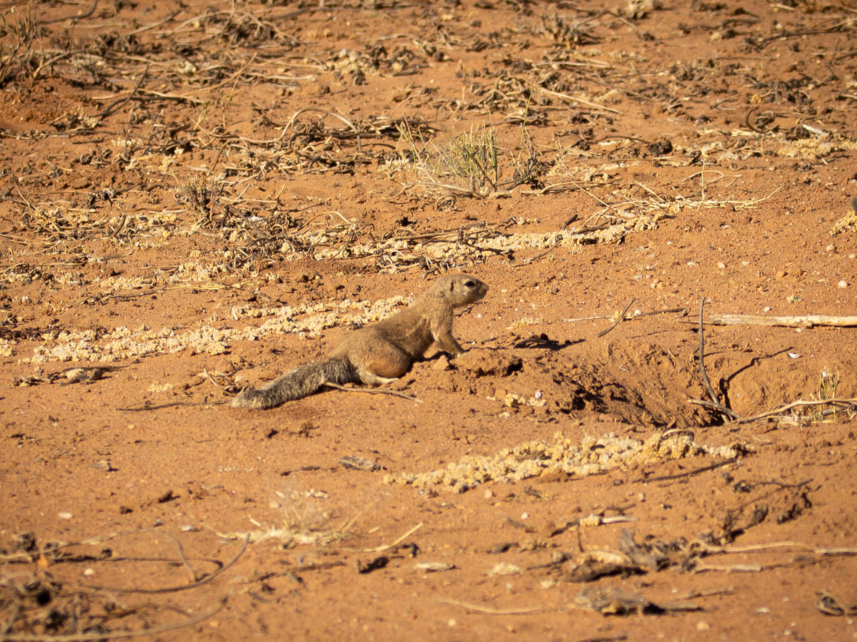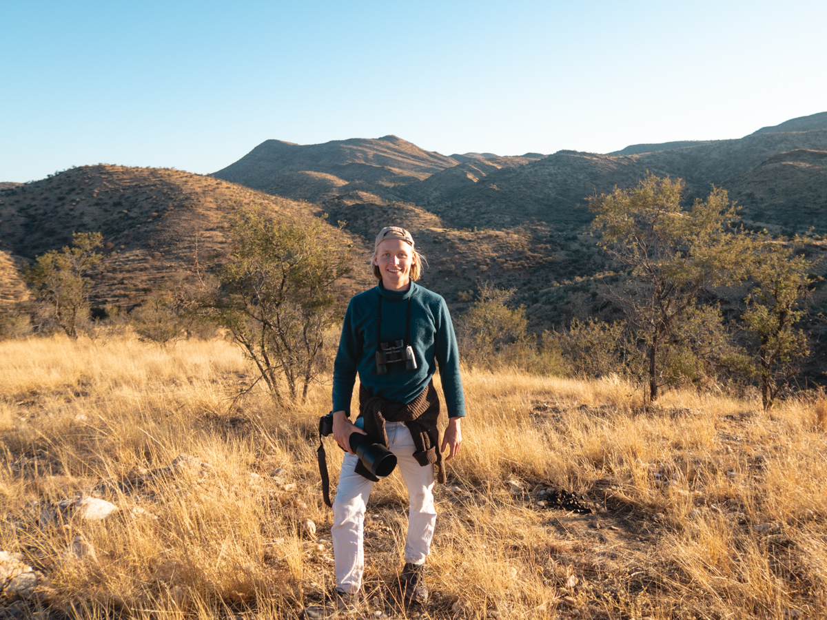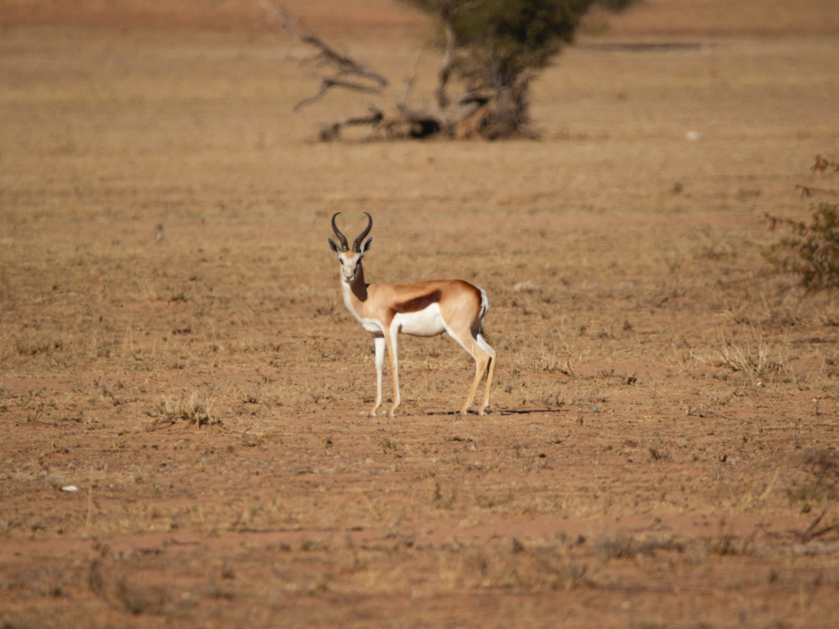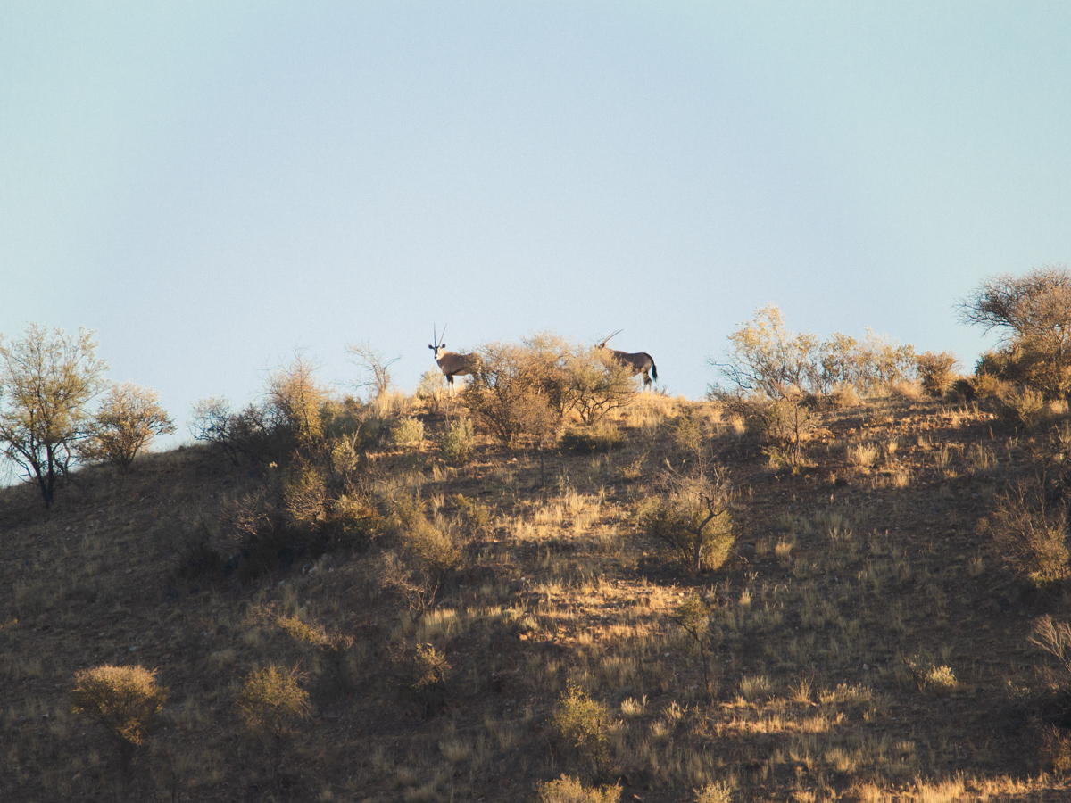 Auf Krumhuk leben Bergzebras, sie sind etwas kleiner, vergleichbar mit Eseln. Die meisten anderen größeren Tiere haben wir schon bei unseren Spaziergängen gesehen. Springböcke ziehen zahlreich durch die „goldene Aue“, so heisst hier ein Landstrich in dem nicht gejagt wird und mehrere Wasserbecken liegen. Das sorgt dafür, dass sich die Tiere häufig in der Nähe aufhalten. In der Regenzeit (Januar-April) steht hier hohes Gras. Jetzt liegt die „goldene Aue“ gold und rötlich vom Sand und den abgegrasten Stoppeln da. Der einzige Jäger in der „goldenen Aue“ ist der Leopard. Die Gegend in der wir uns befinden hat angeblich die höchste Dichte von Leoparden. Sie sind sehr scheu, sodass selbst die meisten Menschen, die hier wohnen, sie noch nicht zu Gesicht bekommen haben. Nur die Spuren verraten, dass sie da sind und die Aufnahmen der Nachtkameras. Immer wieder findet man abgenagte Skelette von anderen Tieren.
