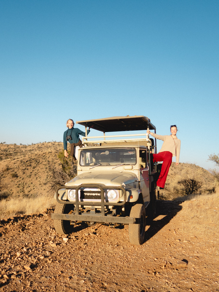Der Gamedrive startete vor unserer Ferienwohnung. Florian fuhr mit einem alten Toyota vor, der auf seiner Pritsche erhöht zwei Sitzreihen hat mit einem Dach darüber, sodass man, vor der Sonne geschützt, über das Dach des Führerhauses schauen kann und einen guten Rundblick hat. Wir wurden da oben richtig durchgeschüttelt und manchmal haben wir nicht mehr den Sitz unter uns gespürt.