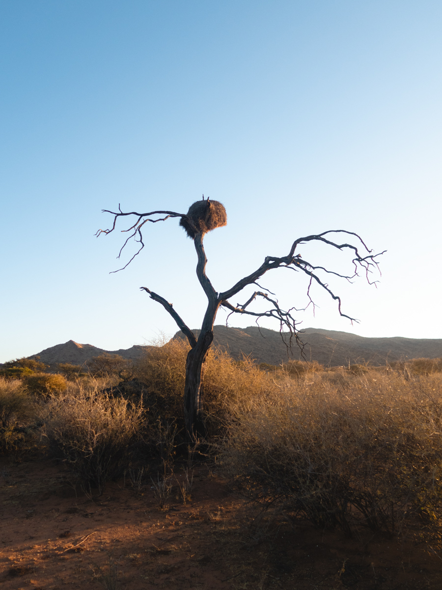 Als wir nun alles gesehen hatten, fahren wir unter einem farbenfrohen Himmel weiter. Auf dem Weg sahen wir noch ein riesiges Strohgebilde in den Bäumen, ein Webervogelnest. Die Webervögel bauen diese großen Nester in Gemeinschaft und bewohnen sie zusammen. Wie eine Art „Vogelhotel“. „Nicht selten“, erzählt uns Florian, „lebt mit ihnen auch eine Schlange zusammen, die sich ab und zu ein Ei nimmt, dafür aber das Nest vor anderen Tieren schützt“. Kurz bevor es dunkel wird kommen wir in unserer Unterkunft auf Krumhuk wieder an.
