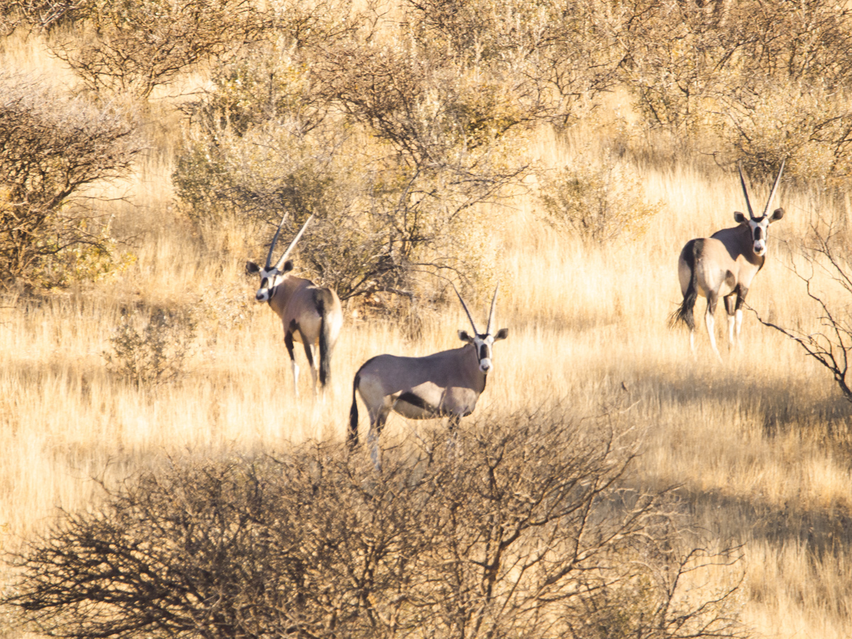Weitere Tiere sind Kudus. Die Männchen haben spiralförmig gewundene Hörner, die Weibchen haben haben keine Hörner. Man kann sie gut an ihren grossen Ohren erkennen. Die Kudus können besser Hören als Sehen. Somit kamen wir ihnen auch Näher als den ähnlich grossen Oryx-Antilopen. Die Oryxe haben lange gerade Hörner, die sie auch zu ihrer Verteidigung z.B gegen Löwen einsetzen. Oft haben wir sie im Busch entdeckt. Einmal, als wir auf einer Decke saßen, schrieben und malten, standen sie plötzlich hinter uns und ich kann nicht genau sagen, ob sie oder wir uns mehr erschreckt haben, da wir sie überhaupt nicht kommen hörten.
