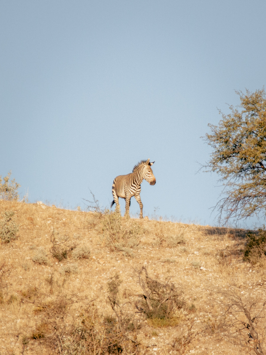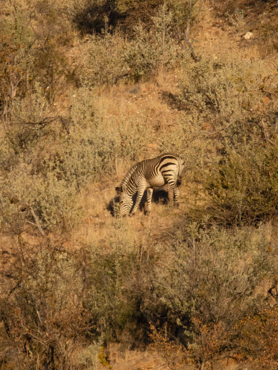 Wir sehen viele Spuren von Zebras, doch selber entdeckten wir sie bisher nicht. Die Sonne geht schon unter und wir machen uns auf den Rückweg. Da erblicken wir plötzlich eines auf einem Bergkamm. Wir bleiben stehen, denn jetzt sehen wir auch noch zwei weitere Zebras am Hang stehen. Und wenig unterhalb auch Kudus. Könnt ihr sie auch entdecken?